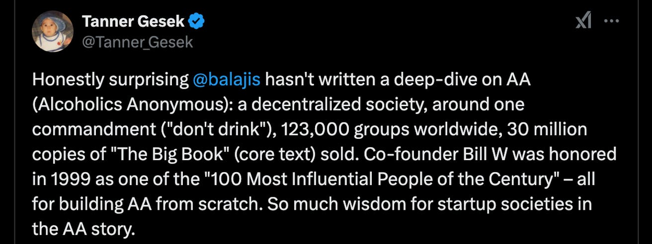 My whole thing in this piece is that more people should pay attention to AA’s founding and growth. If such an apparently-crazy notion can be at the center of such a successful society, surely less esoteric ideas can flourish too. But beyond that, if you’re building a startup society, I hope this essay helps encourage you.